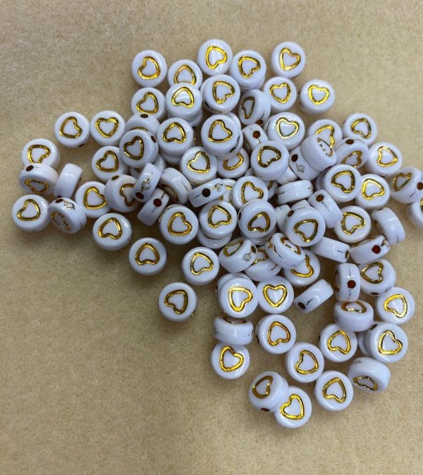 White acrylic beads with a gold plated heart outline carved into the middle. These flat round beads measure 7mm x 4mm with a 1.5mm hole. You will get approx. 100 beads per pack.