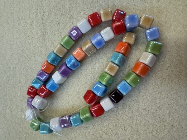 Mixed colour ceramic cubes measure 6 x 6mm with a 2mm hole. There are approx. 50 beads per strand.
