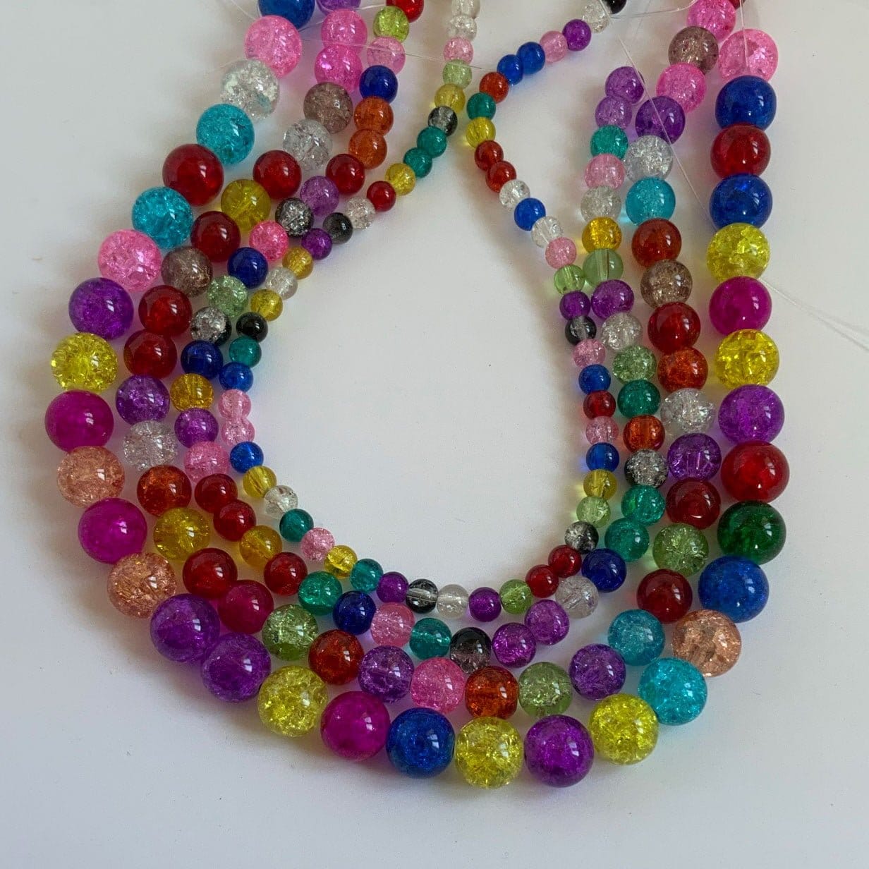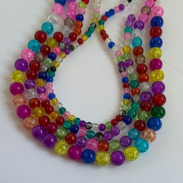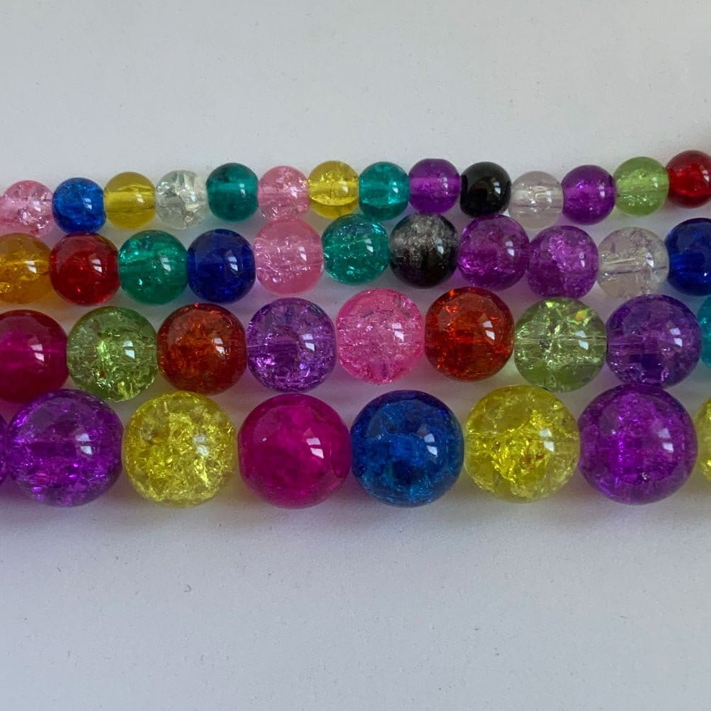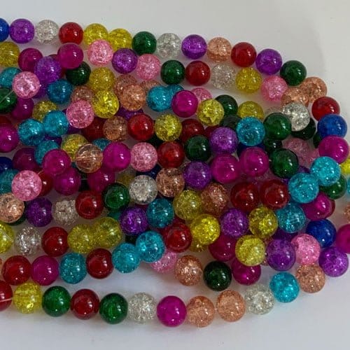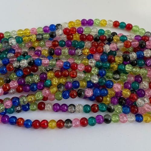 Brightly coloured crackle glass beads available in 4mm, 6mm, 8mm, 10mm and 12mm. Sparkly great value glass beads. Colour mix is totally random and will differ from those shown. Strand length 16″