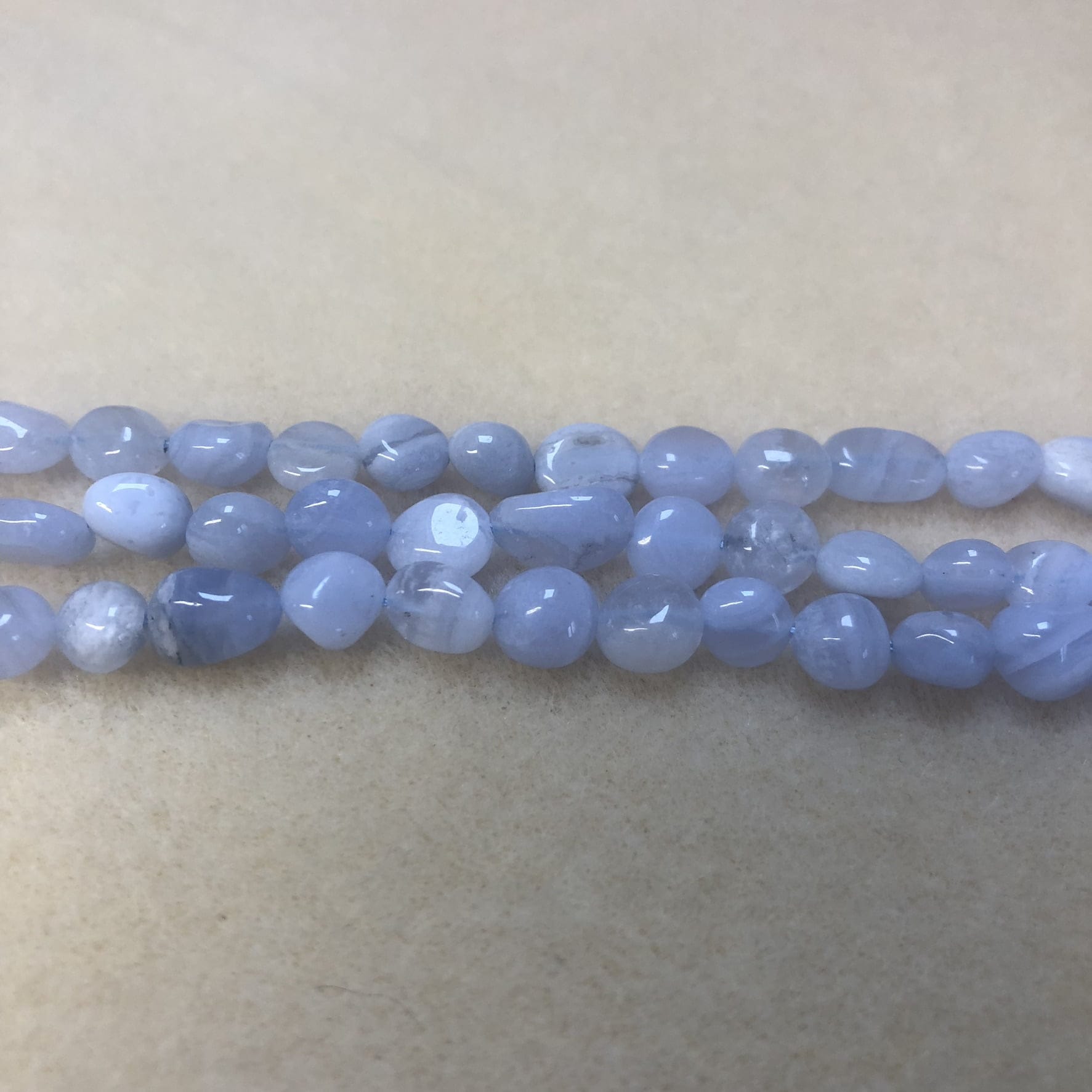 Tumbled Blue Lace Nuggets measuring between 6-8mm. Hole size approx. 0.8mm with around 45 beads per strand.