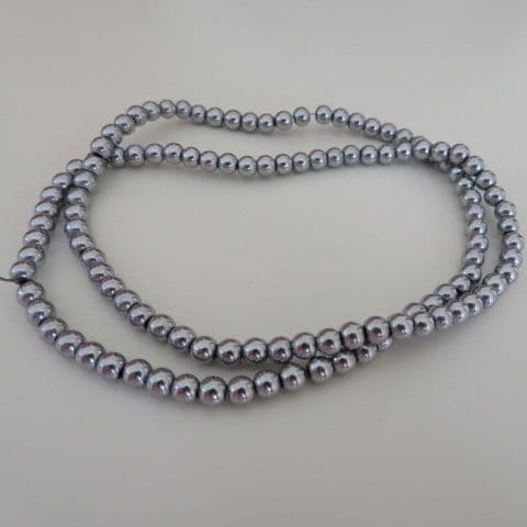 Hematite Silver Beads 4mm. Hematite is the mineral form of iron oxide. These Hematite beads are electroplated in a silver colour. Sold on a strand of approximately 105 beads with a 1mm hole.