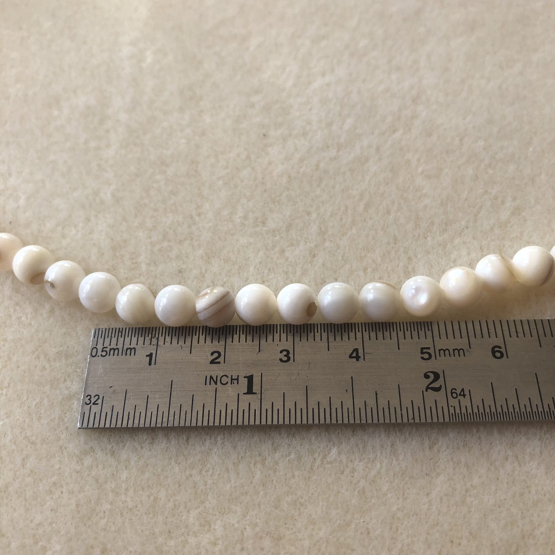 Freshwater shell round beads.  Sold on a strand of approximately 60 beads.  Measuring 6mm with a 1mm hole.  Sizes are varied and approximate.  Colour is cream to beige.  As this is a natural product some colour differences will occur but the image shown is a good indication of the product.
