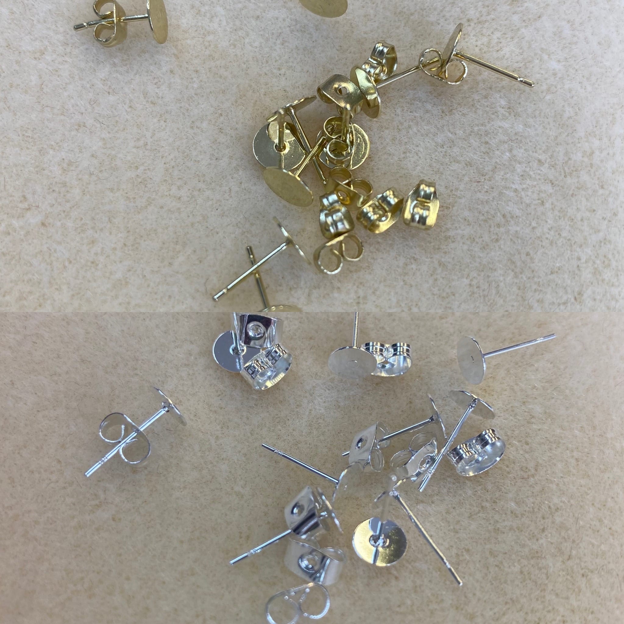 Glue on earring posts, 5 pairs with backs, available in silver plate or gold plate.