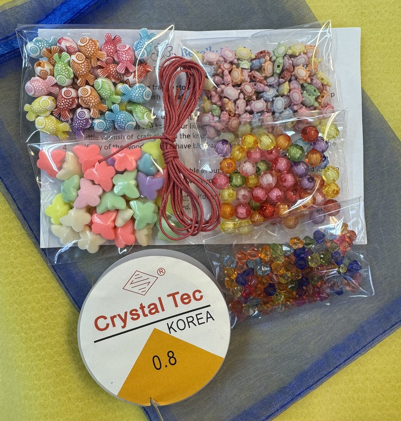 A bag full of fun – delivered to your door! 5 packs of acrylic beads plus a 10 metre reel of elastic and a bundle of waxed cotton. The selection of beads and colours of cord and elastic is random but if you have any preferences contact us and we will do our best! A great gift for ages 3 – 12. We also do a wooden beady bag.