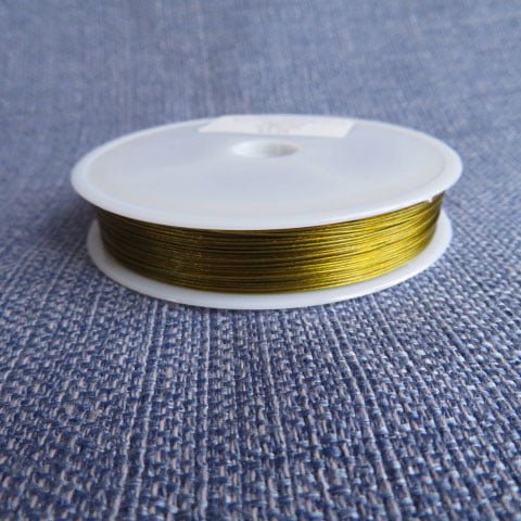 Tiger tail braided steel jewellery wire. Gold colour, coated with nylon to make it easy to thread. Approximately 55 metres per reel. The perfect stringing material for your beading projects.